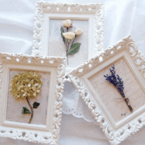 Материал для картин в виде плоских аппликаций сушат прессованием. Гербарий можно сделать из любимых садовых цветов или провести сбор полевых растений. В качестве декоративных элементов можно использовать не только соцветия, но и листья, семена, изогнутые побеги. На плотной однотонной бумаге выкладывают любую композицию, фиксируют всё клеем и помещают готовую работу под стекло фоторамки.