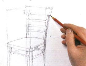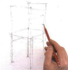 Внимательно изучите стул и измерьте его пропорции с помощью карандаша в вытянутой руке. Возьмите карандаш и нарисуйте в перспективе два стоящих один на другом ящика. Очень вероятно, что точки схода при этом окажутся за пределами вашего листа бумаги. Вы можете подложить справа и слева дополнительные листы бумаги, чтобы продлить эти линии.