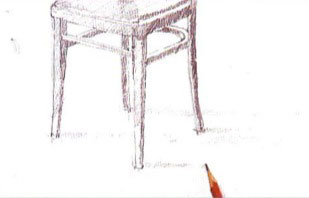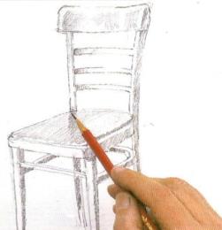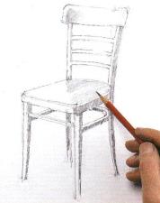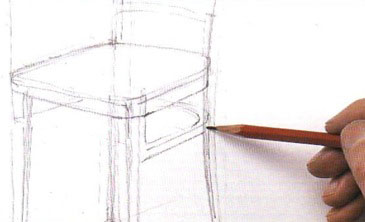 Очертите контуры стула более жирной линией. Следите за тем, чтобы все детали стула располагались в соответствии с конструкционными линиями. Подчеркните контуры слегка скошенных ножек стула, закругленные углы сиденья и распорки под ним.