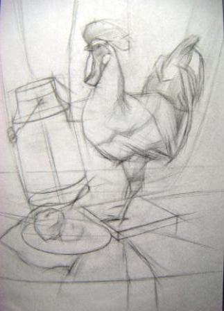 Прежде чем начать работу над рисунком группы предметов (натюрморта), необходимо их внимательно проанализировать, рассматривая предметы со всех сторон, выбирая при этом наиболее выгодные с точки зрения композиционной выразительности постановки. Следует обратить внимание на их освещенность. Наиболее выразительно освещены предметы при боковом верхнем освещении. Исходя их этого, выбрав для себя определенную точку зрения, следует подумать, как лучше разместить предметы на листе. При выборе места не следует садиться против света.