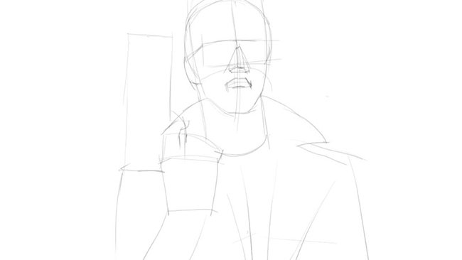 3. Теперь переходи к рисованию лица, в частности носа и губ. Заштрихуй очки, некоторые части головы и шеи. Изобрази складки на одежде.