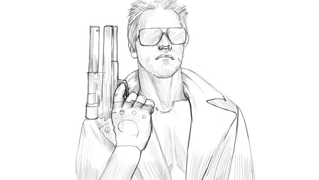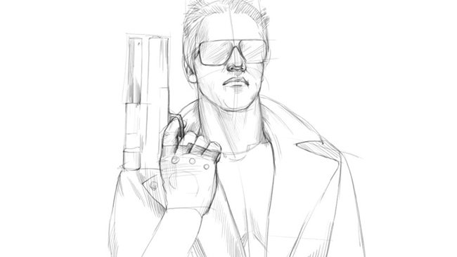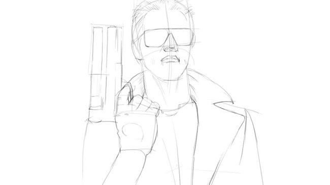2. Нарисуй очки, волосы и пальцы Терминатора. Легкими движениями прорисуй детали пистолета.