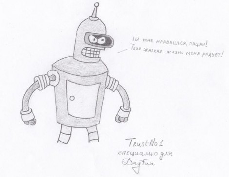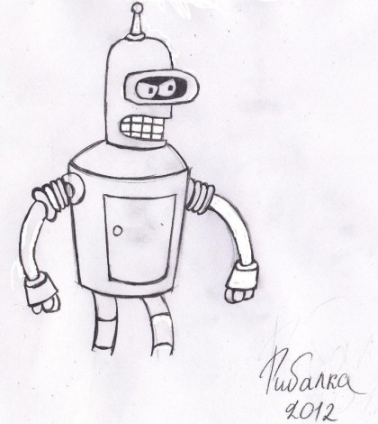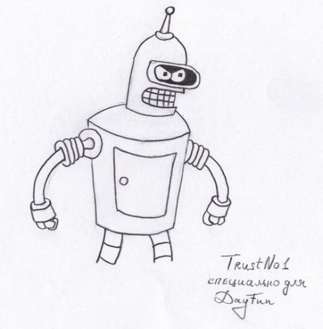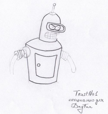 Но это не слишком хороший способ научится рисовать, ведь для таких рисунков требуется уже достаточно хорошие умения в этом деле. Возьмем что-нибудь попроще. Предлагаю нарисовать Бендера из Футурамы .