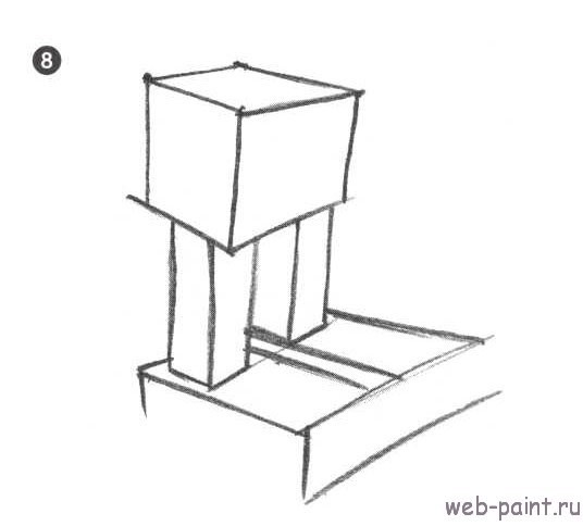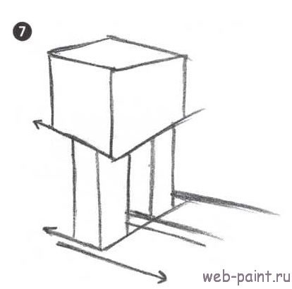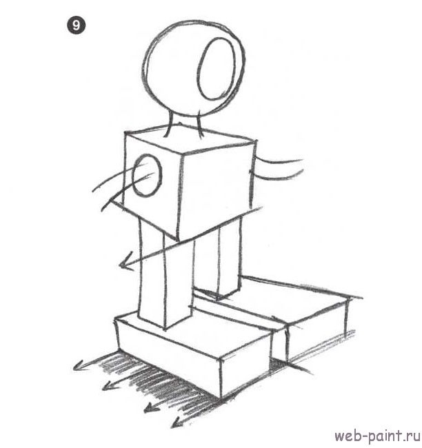 5. Соедините нижние края коробки, это будет туловище робота. Теперь рисуем ближнюю ногу, опять же среднюю линию делаем длиннее. Мы спрятали верхнюю часть ноги за торсом, используя закон перекрытия. Также мы должны использовать «размер»: ближняя нога должна быть больше, чем дальняя. В одном рисунке должны совместиться все правила рисования в 3D, так мы придадим эффект глубины и объема рисунку. Вы заметили, что необходимо сместить среднюю линию ноги от средней линии туловища? Это придает изображению больше характера.