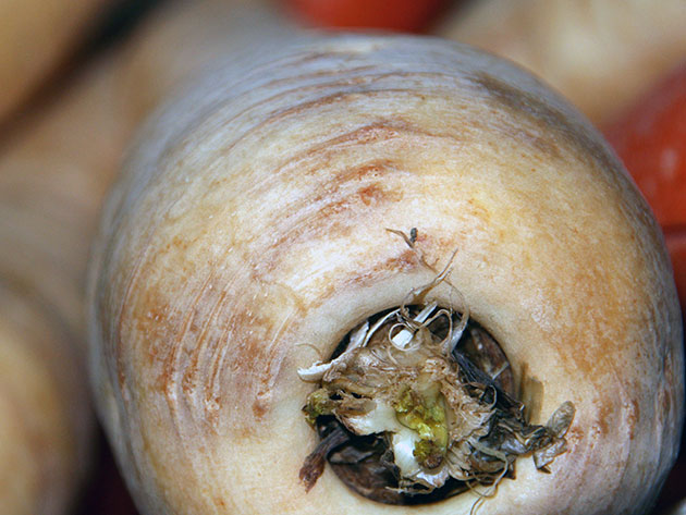 Мокрая бактериальная гниль – заболевание широко распространенное, особенно в условиях нестабильной температуры и повышенной влажности. Оно поражает корнеплоды и во время хранения, и в поле. Начинается болезнь с загнивания в хвостовой части – сначала на растении появляются темные водянисто-маслянистые пятна, потом на их месте образуются углубления с гниющей зловонной массой, которая вытекает из плодов в виде слизи, из-за чего распространение инфекции на другие растения происходит очень быстро.