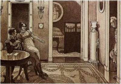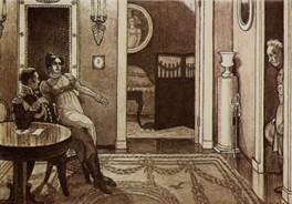 Смотритель начинает бороться за свою дочь. Он пешком отправляется на поиски Дуни и надеется привезти домой свою заблудшую овечку. Минский, встретив в прихожей смотрителя, особенно не церемонится с ним, объясняя, что Дуня с ним будет счастлива, откупился от Вырина деньгами, которые потом тот выбросил. Во второй раз слуга ротмистра объяснил Вырину, что «барин никого не принимает, грудью вытиснил из передней и хлопнул дверей ему под нос». Когда Вырин в третий раз осмелился потребовать у Минского свою дочь, гусар вытолкнул его на лестницу. Минский по-настоящему любит Дуню: окружает её вниманием и роскошью. И Дуня любит своего похитителя: с какой нежностью она смотрела на Минского, на матово-черные его кудри (рис. 2)!